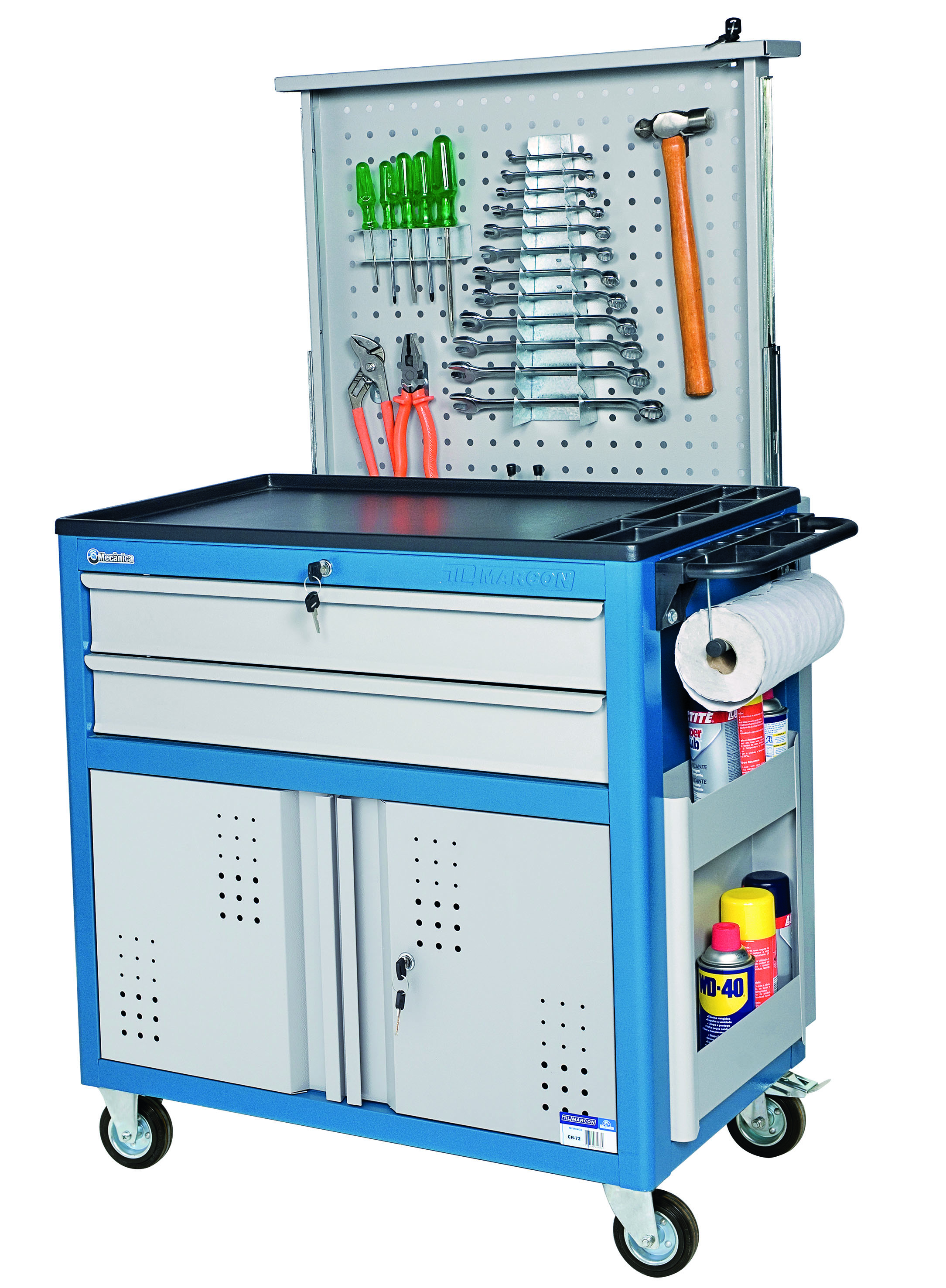 Características: 2 gavetas modelo B; 1 divisória para gaveta (DPG-3); Portas de aço; Painel em chapa perfurada retrátil com acionamento de elevação através de amortecedor; Fechadura com chave; Acompanha ganchos e suportes KIT-GS3 (26 peças); Peso: 48 kg; Rodas: 2 fixas de 4" e 2 giratórias de 4" (uma com freio); 72 ferramentas manuais em aço Cromo-Vanádio organizadas em 2 berços de E.V.A.